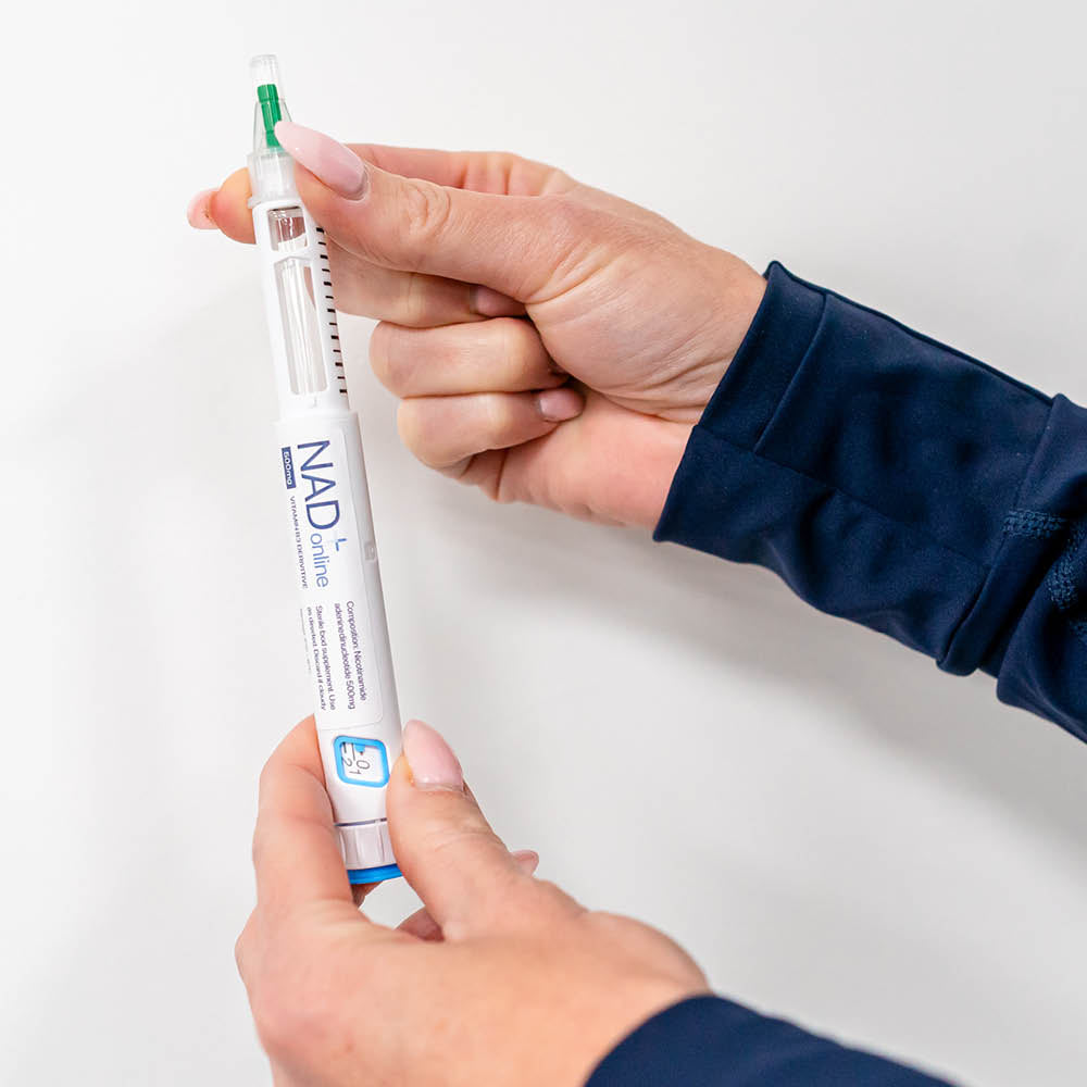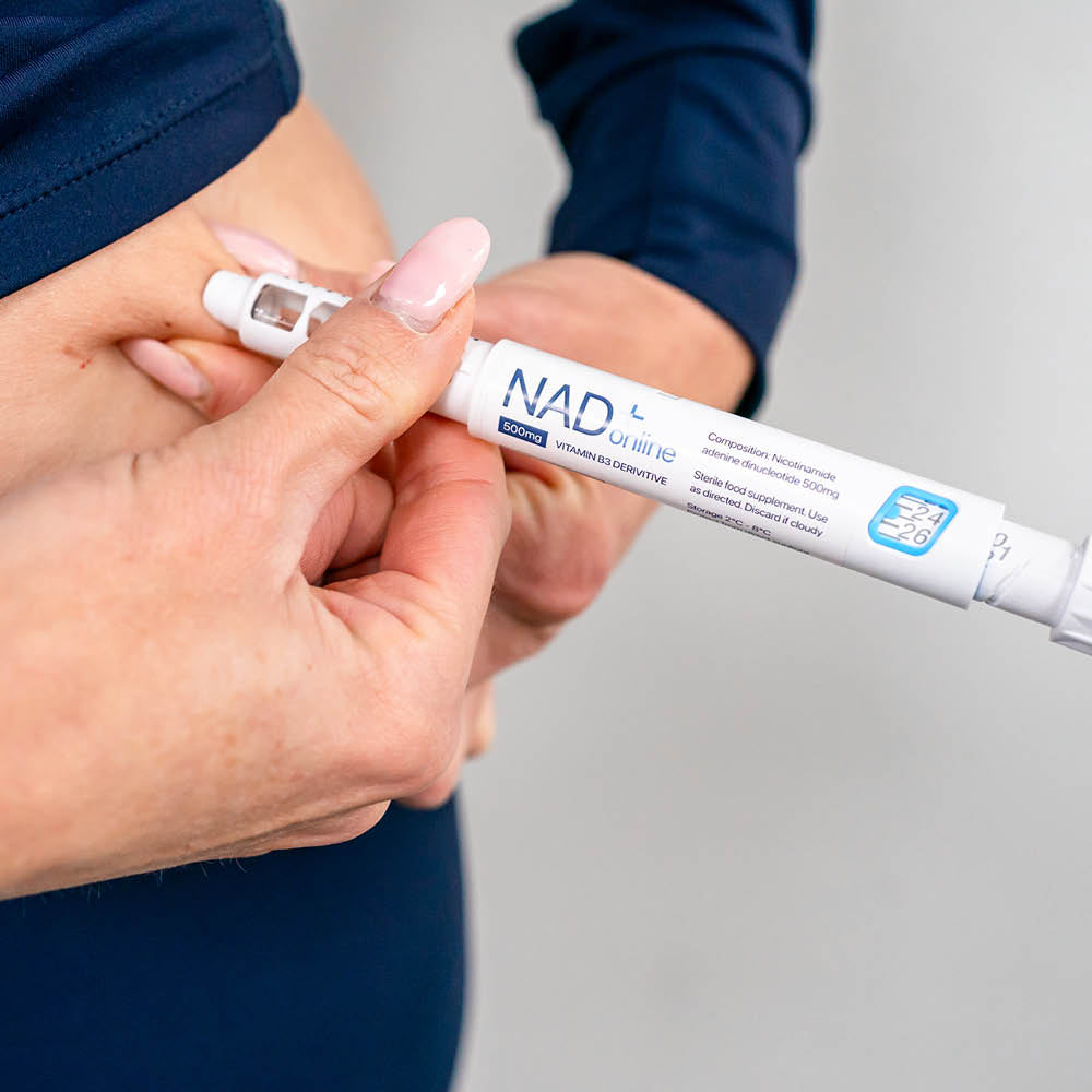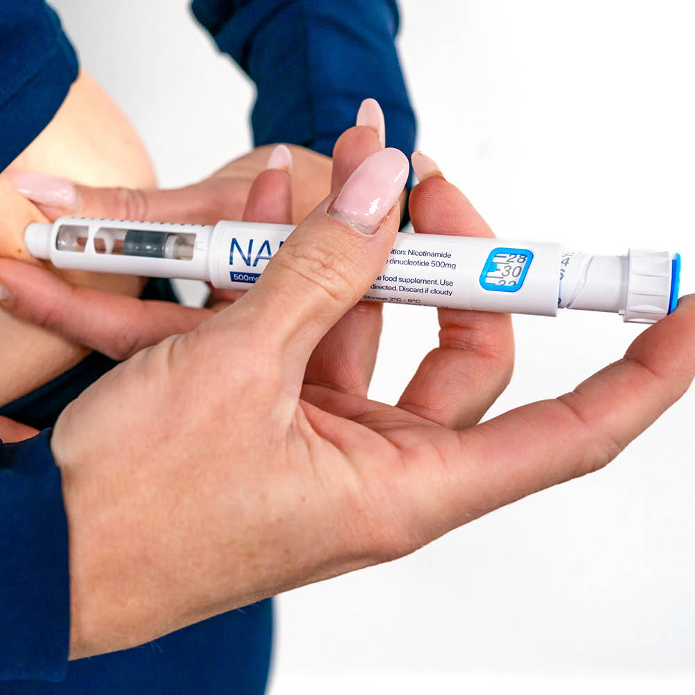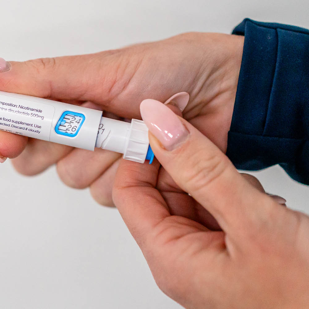 Push firmly on the base of the pen to release the dose of NAD+. Keep the pen steady to minimise bruising. A mild sting is normal. Once the dial reaches zero and the full dose has been delivered, hold the pen in place for ten seconds before removing it.